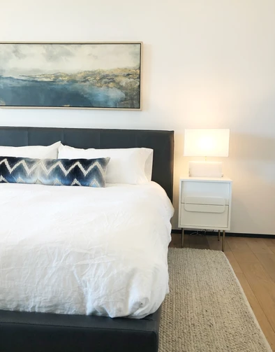 Gorgeous house that needed a few finishing touches to make it feel more like home. Guest bedroom featured an heirloom family chair that we reupholstered in a gorgeous velvet and added new legs. Dark blue leather bed with a custom silk velvet lumbar pillow. It’s all about the details. Limited images due to client privacy.
